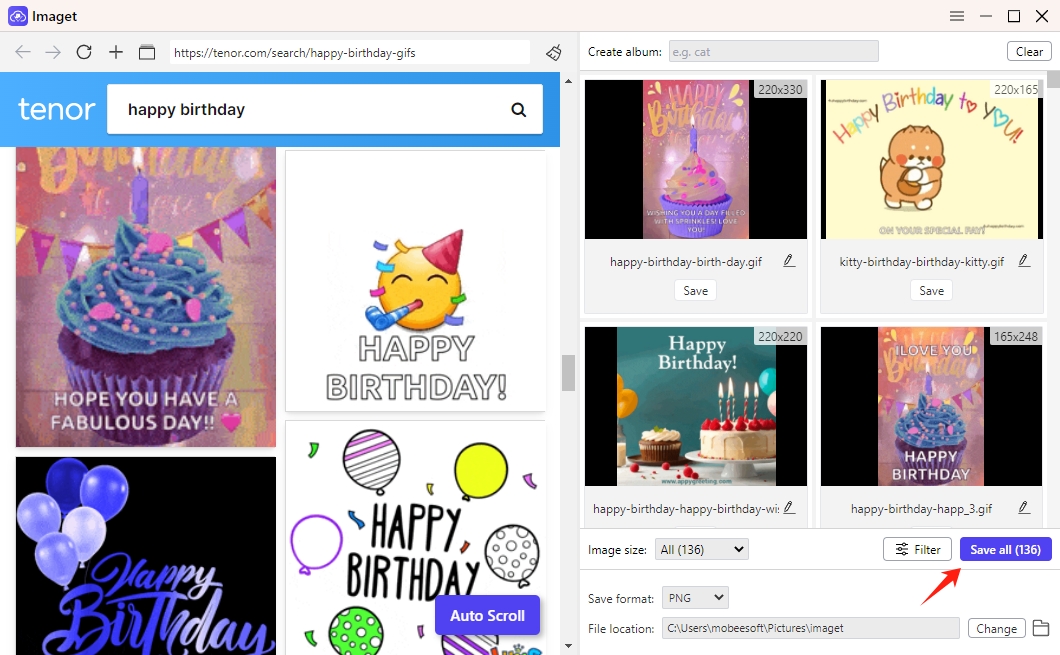 Dopo aver caricato la pagina web, puoi fare clic sul pulsante "Scorrimento automatico" finché non avrai trovato tutte le GIF che desideri scaricare.